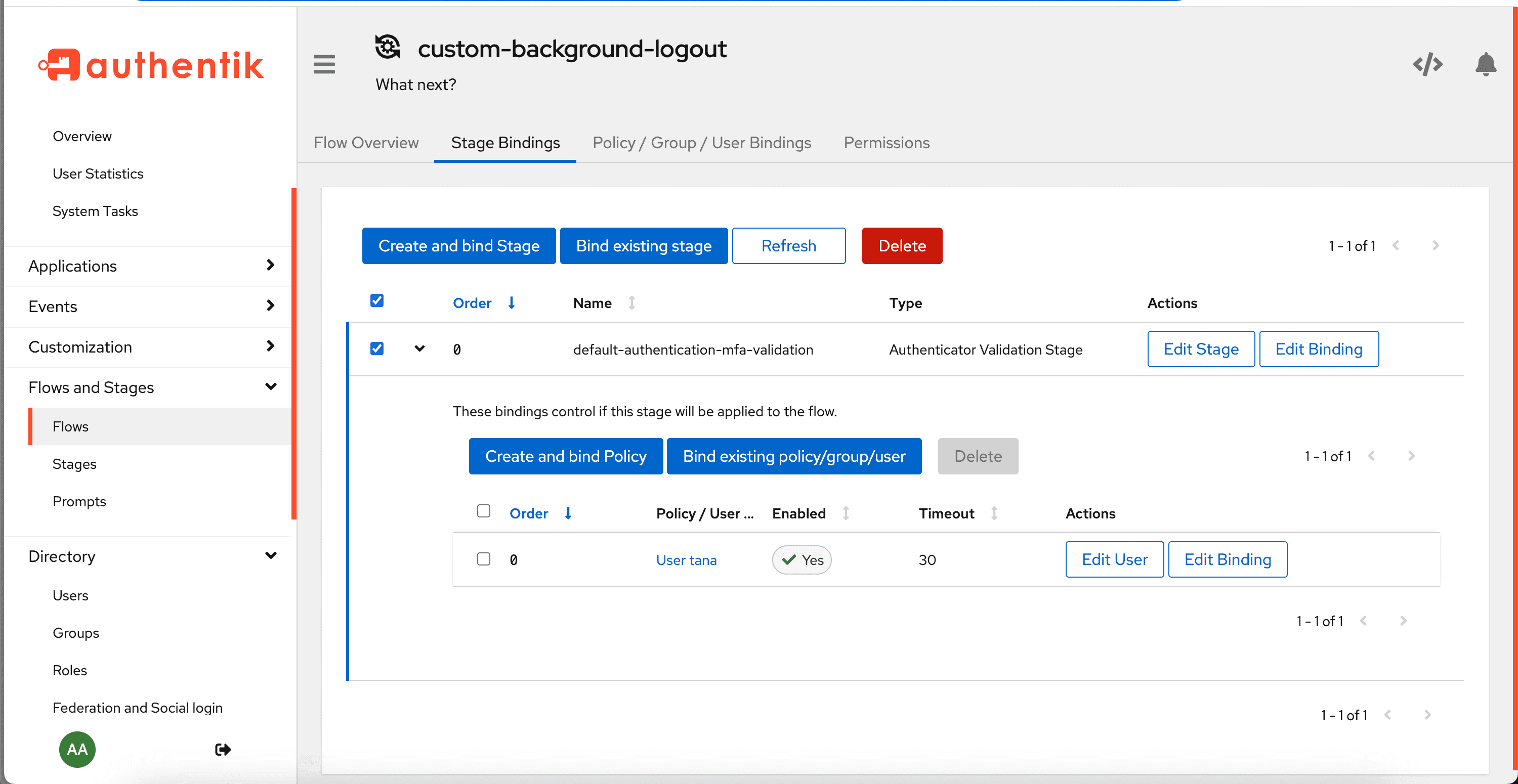 You can use bindings to determine whether or not a stage is presented to a single user or any users within a group. You do this by binding the user or group to a stage binding within a specific flow. For example, if you have a flow that contains a stage that prompts the user for multi-factor authentication, but you only want certain users to see this stage (and fulfill the MFA prompt), then you would bind the appropriate group (or single user) to the stage binding for that flow.